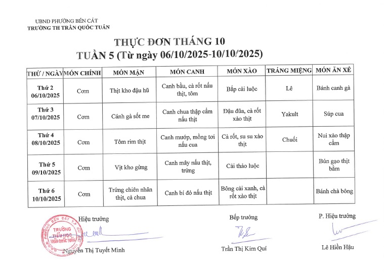 Thực đơn tuần 5 - từ 06/10 đến 10/10/2025